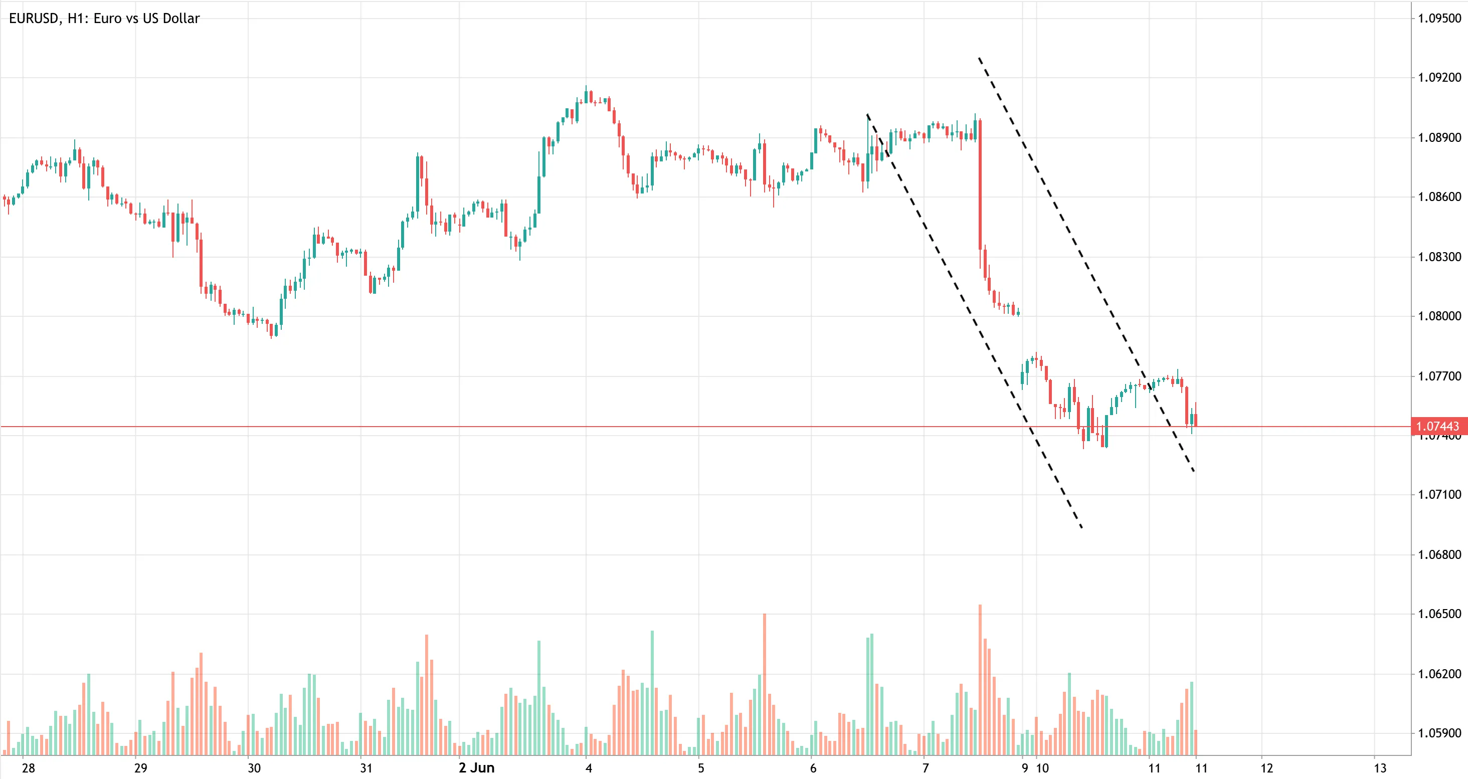 For example, the EU has recently cut interest rates. The chart illustrates the EUR/USD exchange rate on an hourly basis, revealing a sharp decline in the value of the Euro (EUR) against the US Dollar (USD). This downward trend corresponds with the European Central Bank (ECB) cutting interest rates, which typically results in the depreciation of the Euro.