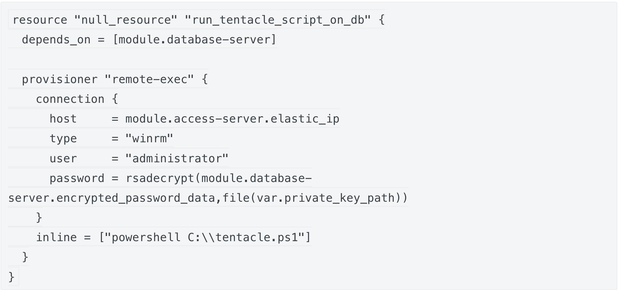 Using this resource, we managed to register on the Octopus Deploy Server all the public and private IP addresses, the hostnames, and the passwords of the newly created instances. The same variables were later on called within the processes running in Octopus Deploy.
