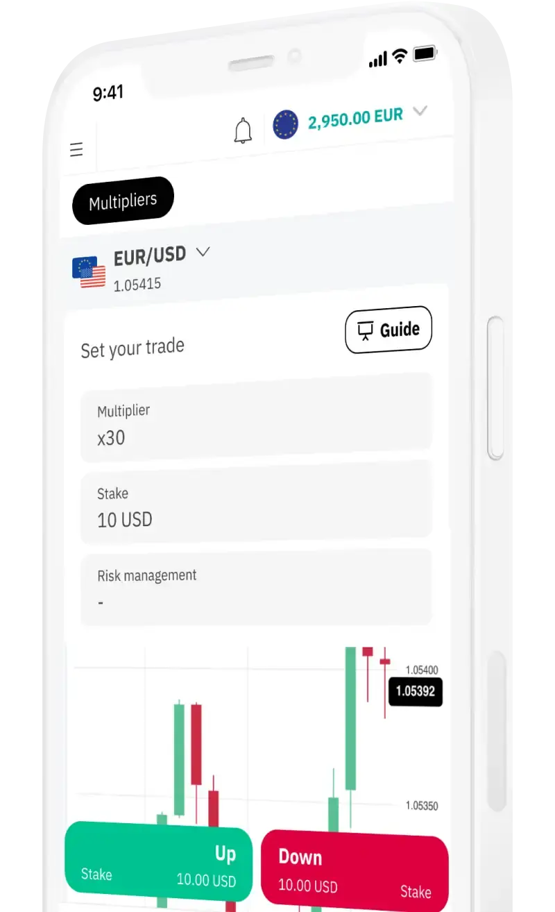 Trade Multipliers on financial markets and 24/7 Derived Indices. Start with just 1 USD and multiply potential profits without losing more than your stake.