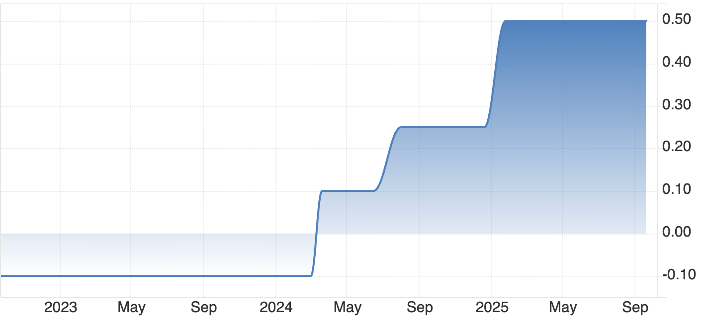 Alt text: A line chart showing interest rate movements from 2023 to late 2025. The rate remains near zero through 2023, then begins to rise in early 2024.
