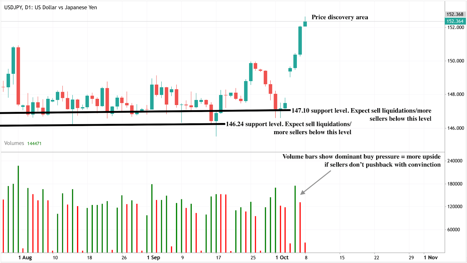 At the time of writing, buy pressure is evident on the daily chart, with the pair in price discovery mode around 152.36. Volume data shows buyer dominance, and sellers have not yet shown enough conviction to challenge the trend.